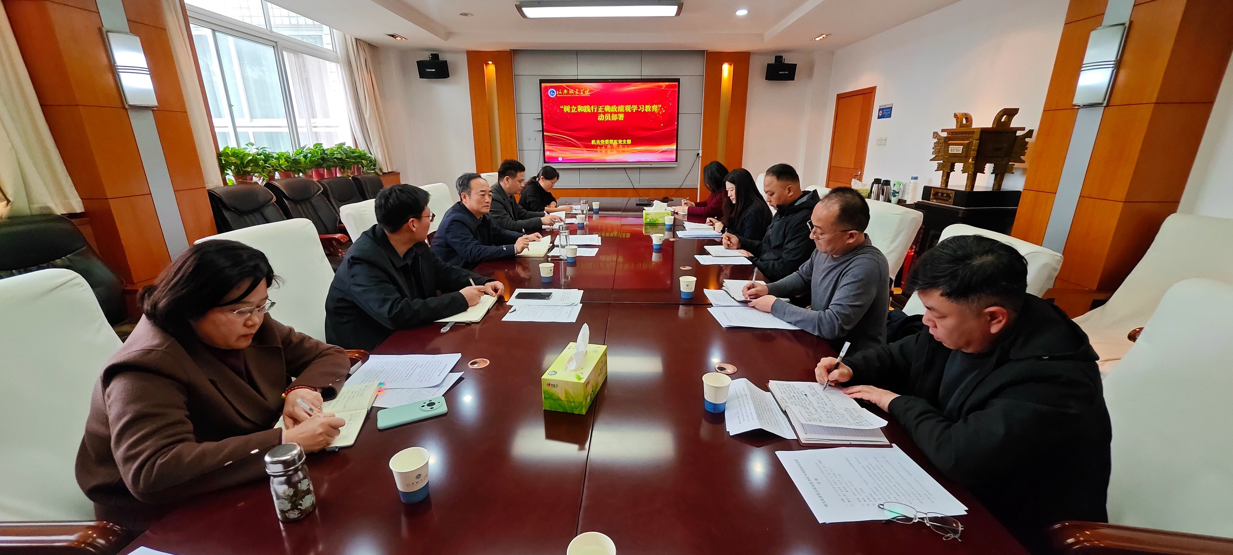 3月13日下午,机关党委第五党支部在行政楼第二会议室召开“树立和践行正确政绩观学习教育”专题部署会,深入贯彻习近平总书记相关重要论述,落实上级及校党委工作部署,校准党员干部履职方向、锤炼过硬作风。校纪委书记、监察专员张高峰出席,纪委副书记卫柳艳主持,支部全体党员参会。