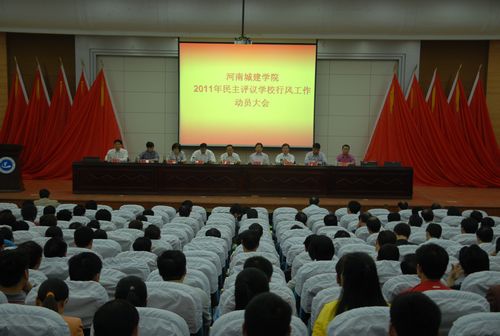 (通讯员 马照民)5月11日下午,我校在学术报告厅召开2011年民主评议学校行风工作动员大会,院党委书记李德平出席会议并作重要讲话,院长孔留安出席会议并作动员讲话,出席会议的校领导还有史战芳、王召东、李建生、陈丙义、张坤书、王春阳、赵金安等。会议由副院长陈丙义主持。全校副科级以上干部及全体辅导员参加会议。